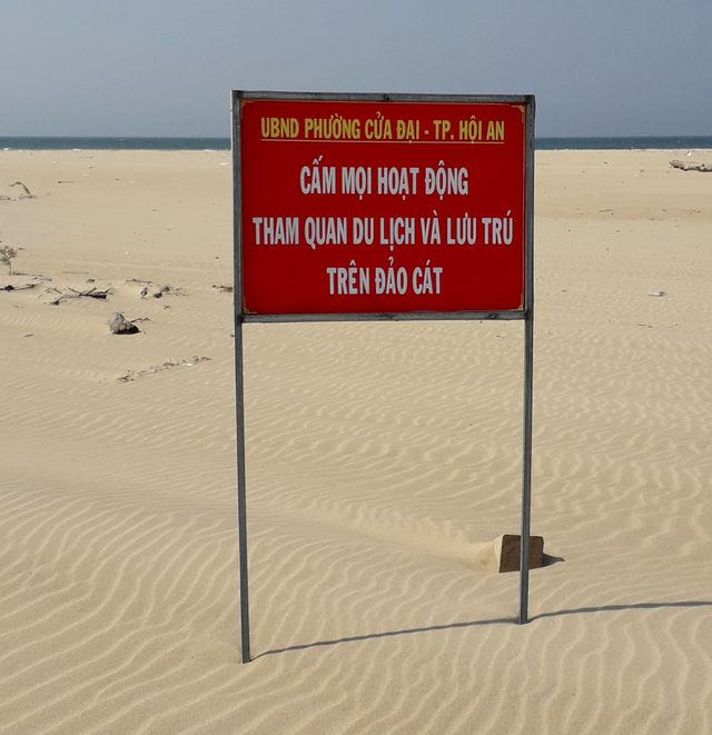 Hiện UBND phường Cửa Đại đã có biển cấm các hoạt động tham quan và lưu trú trên đảo cát này.