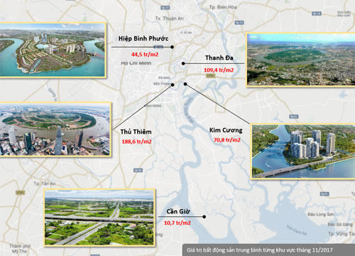 Trong khi đó, với vị thế cách quận 1, khu trung tâm hiện hữu của TP HCM chỉ một bờ sông, bán đảo Thủ Thiêm (quận 2) đã tăng giá 138% so với cùng kỳ. Giá đất bình quân tại Thủ Thiêm hiện nay đạt 188,6 triệu đồng mỗi m2.