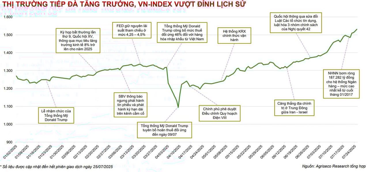 Trong thời gian tới, Agriseco Research dự báo 3 động lực lớn sẽ tiếp tục nâng đỡ thị trường trong nửa cuối năm. Thứ nhất, giải ngân đầu tư công được đẩy mạnh, tập trung vào các dự án hạ tầng trọng điểm như cao tốc Bắc Nam, sân bay Long Thành, vành đai đô thị hay cảng biển. Thứ hai, dòng vốn tín dụng và tiêu dùng phục hồi mạnh, được hậu thuẫn bởi mặt bằng lãi suất thấp, chính sách giảm thuế VAT và các gói tín dụng ưu đãi. Thứ ba, thị trường đang đứng trước cơ hội nâng hạng lên nhóm “Mới nổi thứ cấp” theo FTSE ngay cuối năm nay. Việc nâng hạng sẽ giúp Việt Nam thu hút dòng vốn ETF và quỹ chủ động toàn cầu, với quy mô hàng tỷ USD, tạo hiệu ứng lan tỏa mạnh mẽ đến toàn thị trường.