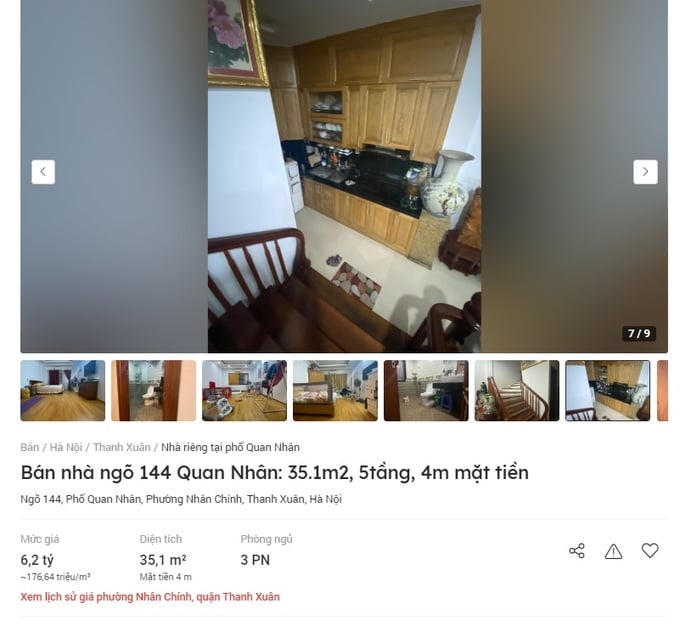 Sau khoảng thời gian chứng kiến đà đi lên mạnh mẽ của chung cư, bất động sản Hà Nội thời gian qua tiếp tục đón nhận một "làn sóng" tăng "phi mã" của nhà đất thổ cư, trong đó có cả nhà đất trong ngõ. Trên trang thông tin Batdongsan.com.vn, giá một căn nhà ở ngõ 144 Quan Nhân, phường Nhân Chính, quận Thanh Xuân, Hà Nội với diện tích 35,1m2, 5 tầng, mặt tiền 4m đang được chào bán 6,2 tỷ đồng, tương đương 176,64 triệu đồng/m2.