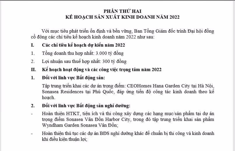 Năm 2022, CEO Group sẽ tập trung triển khai các dự án như CEOHomes Hana Garden City tại Hà Nội, Sonasea Residences tại Phú Quốc, đáp ứng tiến độ công tác kinh doanh theo kế hoạch. Hoàn thiện hạ tầng kỹ thuật, tiện ích và thi công xây dựng các hạng mục/sản phẩm tại dự án Sonasea Vân Đồn Harbor City, trong đó tập trung triển khai sản phẩm Wyndham Garden Sonasea Vân Đồn. Đồng thời, hoàn thiện thủ tục các dự án BĐS nghỉ dưỡng khác để chuẩn bị thi công và kinh doanh khi điều kiện thuận lợi.