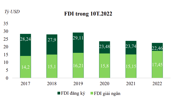 Cùng với đó, giải ngân vốn đầu tư FDI trong ngành cao nhất trong 5 năm qua. Cụ thể, FDI đăng ký trong 10M.2022 đạt 22,46 tỷ USD, vẫn tăng 16,3% yoy nếu không tính dự án LNG Long An 1, 2 với 3,1 tỷ USD và Ô Môn 2 (1,3 tỷ USD) trong năm ngoái. FDI vào công nghiệp chế biến chế tạo vẫn chiếm phần lớn nhất với 57,4% (+1,26% yoy), FDI vào BĐS tăng 82% yoy, đạt 3,9 tỷ USD.