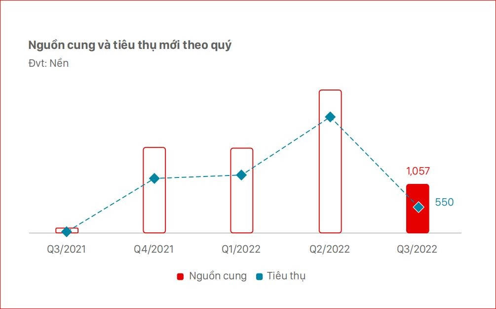 Báo cáo của DKRA Group cho hay, trong quý 3/2022, chỉ có vỏn vẹn 550 nền giao dịch thành công trong tổng số 1.057 nền được chào bán. Tỷ lệ hấp thụ đạt 52%, chỉ bằng 34,4% so với quý trước đó, mức thấp nhất kể từ đầu năm. Đáng chú ý, lượng tiêu thụ tập trung chủ yếu tại các dự án đã có sẵn trong khi không có nhiều dự án mới mở bán.
