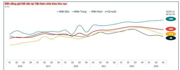 Theo một thống kê của Batdongsan.com.vn, sau một giai đoạn dài từ quý 1/2018 đến quý 3/2023, giá rao bán đất nền miền Nam đã tăng 71%, miền Bắc tăng 54%. Như vậy, trong vòng 5 năm qua, mức độ tăng giá trung bình của đất nền miền Nam cao hơn miền Bắc.