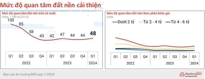 Theo thông tin từ Batdongsan.com.vn, mức độ quan tâm đất nền trên cả nước đang tăng trong quý 1/2024, từ mức 44 điểm của quý 4/2023 lên mức 48 điểm trong quý 1/2024. Đáng chú ý, ở phía Bắc, mức độ quan tâm tăng mạnh ở một số huyện ngoại thành Hà Nội.