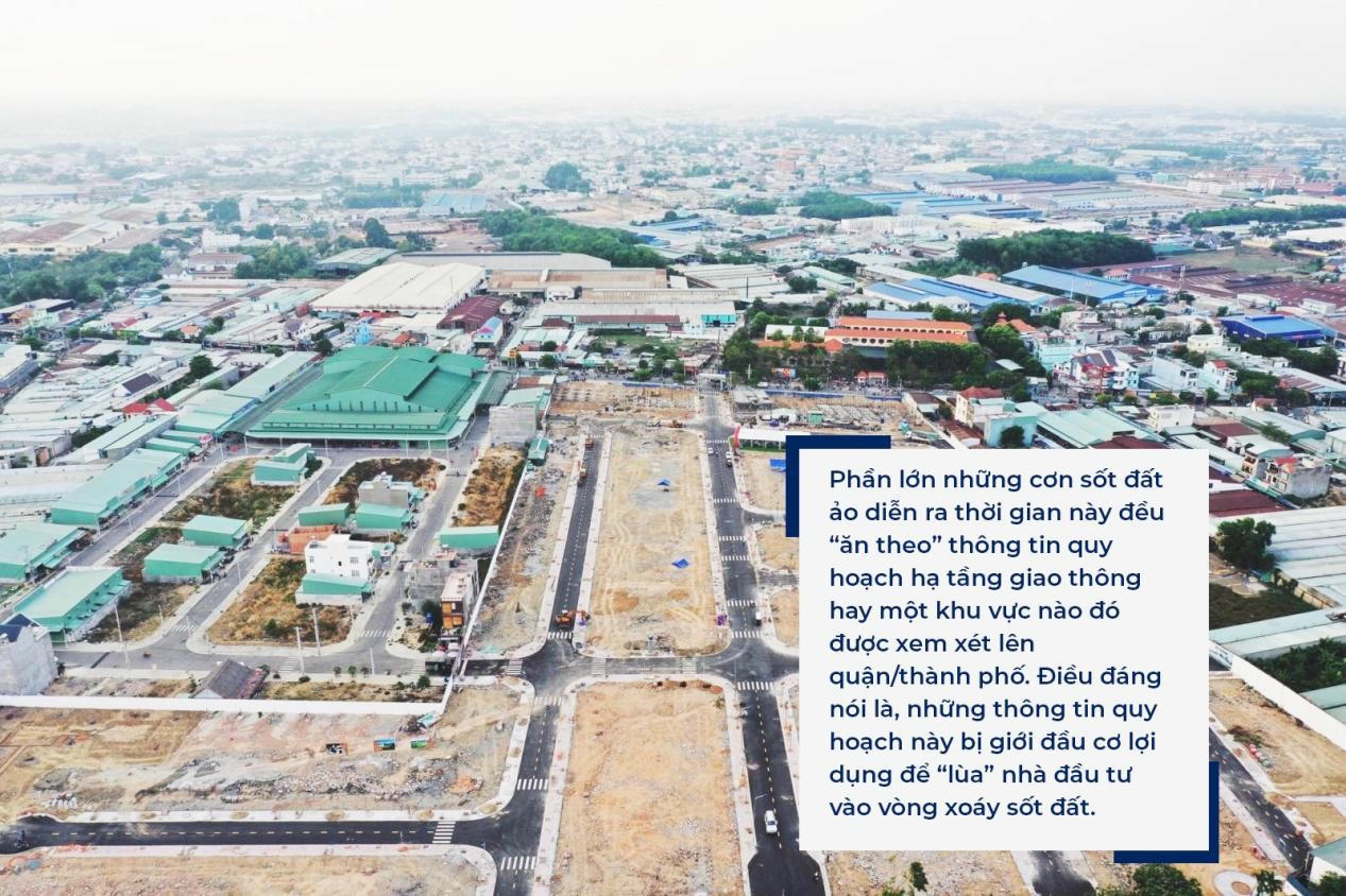 Phần lớn những cơn sốt đất ảo diễn ra thời gian này đều “ăn theo” thông tin quy hoạch hạ tầng giao thông hay một khu vực nào đó được xem xét lên quận/thành phố. Điều đáng nói là, những thông tin quy hoạch này bị giới đầu cơ lợi dụng để “lùa” nhà đầu tư vào vòng xoáy sốt đất. Trong đó, đáng chú ý nhất là tình trạng phân lô, tách thửa đất nông nghiệp để bán mặc cho nhiều địa phương đã có văn bản tạm dừng hoạt động này, nhưng giá đất vẫn không ngừng leo thang.