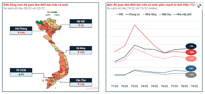 Dữ liệu của Batdongsan.com.vn phản ánh mức độ quan tâm đến bất động sản (BĐS) trên cả nước đã giảm đáng kể từ thời điểm tháng 3/2022. Nhiều tỉnh thành chứng kiến nhu cầu tìm mua BĐS trong quý III/2022 giảm so với quý trước, đơn cử như Hải Phòng ước tính giảm 19%, Đà Nẵng giảm 12%, Cần Thơ giảm 14%.