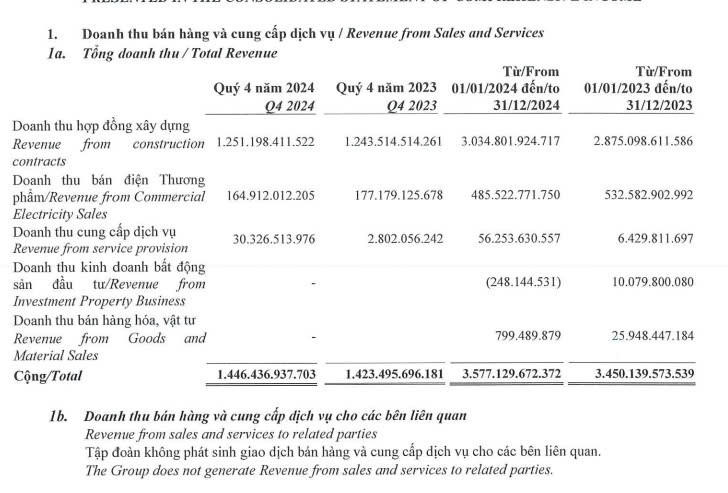 Trong đó, cơ cấu doanh thu bao gồm doanh thu hợp đồng xây dựng ghi nhận 1.251,2 tỷ đồng, chiếm 86,5% tổng doanh thu; doanh thu bán điện thương phẩm ghi nhận 164,9 tỷ đồng, chiếm 11,4% tổng doanh thu; và còn lại 30,3 tỷ đồng là doanh thu cung cấp dịch vụ, chiếm 2,1% tổng doanh thu.