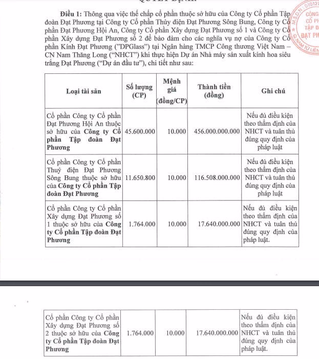 Tập đoàn Đạt Phương thế chấp cổ phần thuộc sở hữu của doanh nghiệp này tại các công ty con/ công ty liên kết, để bảo lãnh thực hiện nghĩa vụ tín dụng cho Công ty cổ phần Kính Đạt Phương.