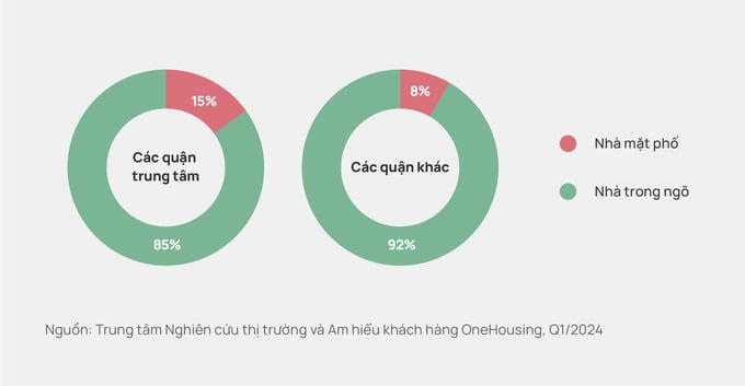 Tổng lượng giao dịch nhà trong ngõ Quý 1/2024 đạt ~9,000 căn, trong đó 92% giao dịch tại các khu vực ngoài trung tâm, do mặt bằng giá trung bình tại đây chỉ tương đương gần 50% so với các quận trung tâm.
