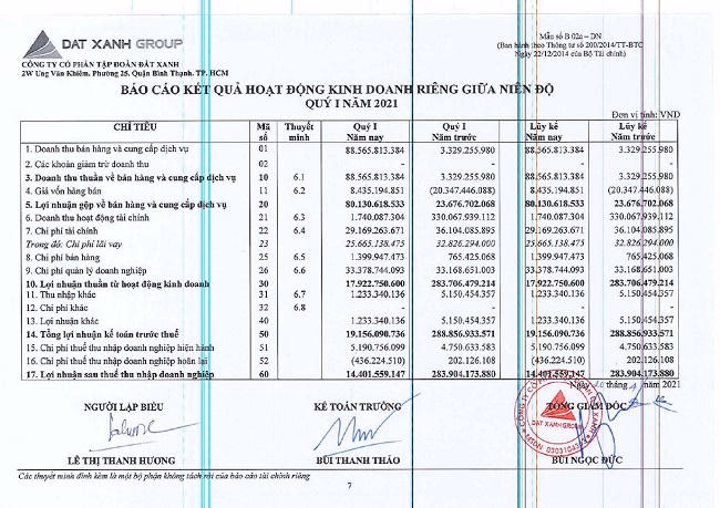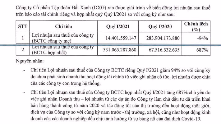 Sau khi trừ đi các khoản chi phí, Đất Xanh ghi nhận gần 712 tỷ đồng LNST quý I, gấp hơn 7 lần cùng kỳ. Trong đó, LNST của cổ đông công ty mẹ hơn 531 tỷ đồng. Theo giải tình của Đất Xanh, LNST của doanh nghiệp tăng chủ yếu là do ghi nhận doanh thu, lợi nhuận từ dự án đã triển khai bán hàng thành công từ năm 2020 và tác động tốt của thị trường đến hoạt động môi giới, dịch vụ của công ty.