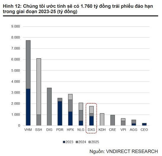 Cũng theo Chứng khoán VNDirect, giá trị trái phiếu đáo hạn trong năm nay và năm 2024 của Đất Xanh lần lượt ở mức 863 tỷ đồng và 251 tỷ đồng.