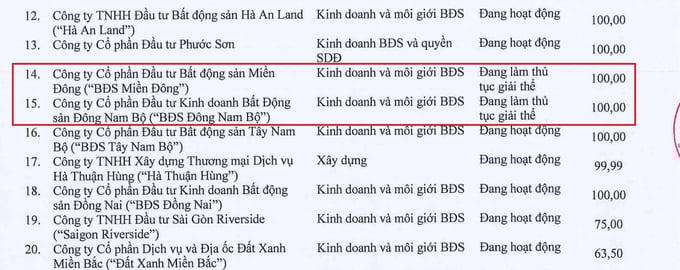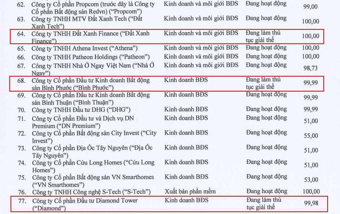 Các công ty này đều do Đất Xanh Group nắm từ 99-100% vốn điều lệ. Nếu hoàn tất thủ tục giải thể, số lượng công ty con của tập đoàn này sẽ giảm từ 86 công ty xuống còn 78 đơn vị.