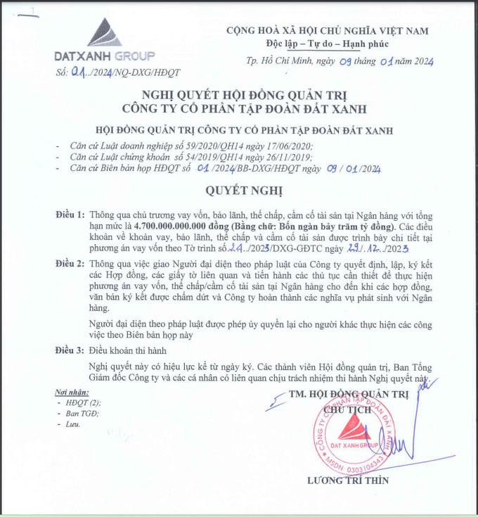 Đồng thời, DXG cũng thông qua việc giao người đại diện pháp luật công ty quyết định, lập, ký kết các hợp đồng, giấy tờ liên quan và tiến hành các thủ tục cần thiết liên quan đến khoản vay này.