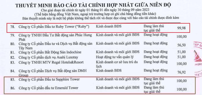 Là một doanh nghiệp hoạt động chính đến từ kinh doanh bất động sản, Đất Xanh cũng không nằm ngoài “cơn bão” đó. Theo thông tin từ Báo cáo tài chính giữa niên độ quý III/2023 cho thấy, tại ngày 30/9/2023, doanh nghiệp có 8 công ty con đang làm thủ tục giải thể, gồm: CTCP Đầu tư bất động sản miền Đông; CTCP Đầu tư kinh doanh bất động sản Đông Nam Bộ; Công ty TNHH Đất Xanh Finance; CTCP Đầu tư kinh doanh bất động sản Bình Phước; CTCP Đầu tư Diamond Tower; CTCP Đầu tư Ruby Tower; CTCP Đầu tư Sapphire Tower; CTCP Đầu tư Emerald Tower.