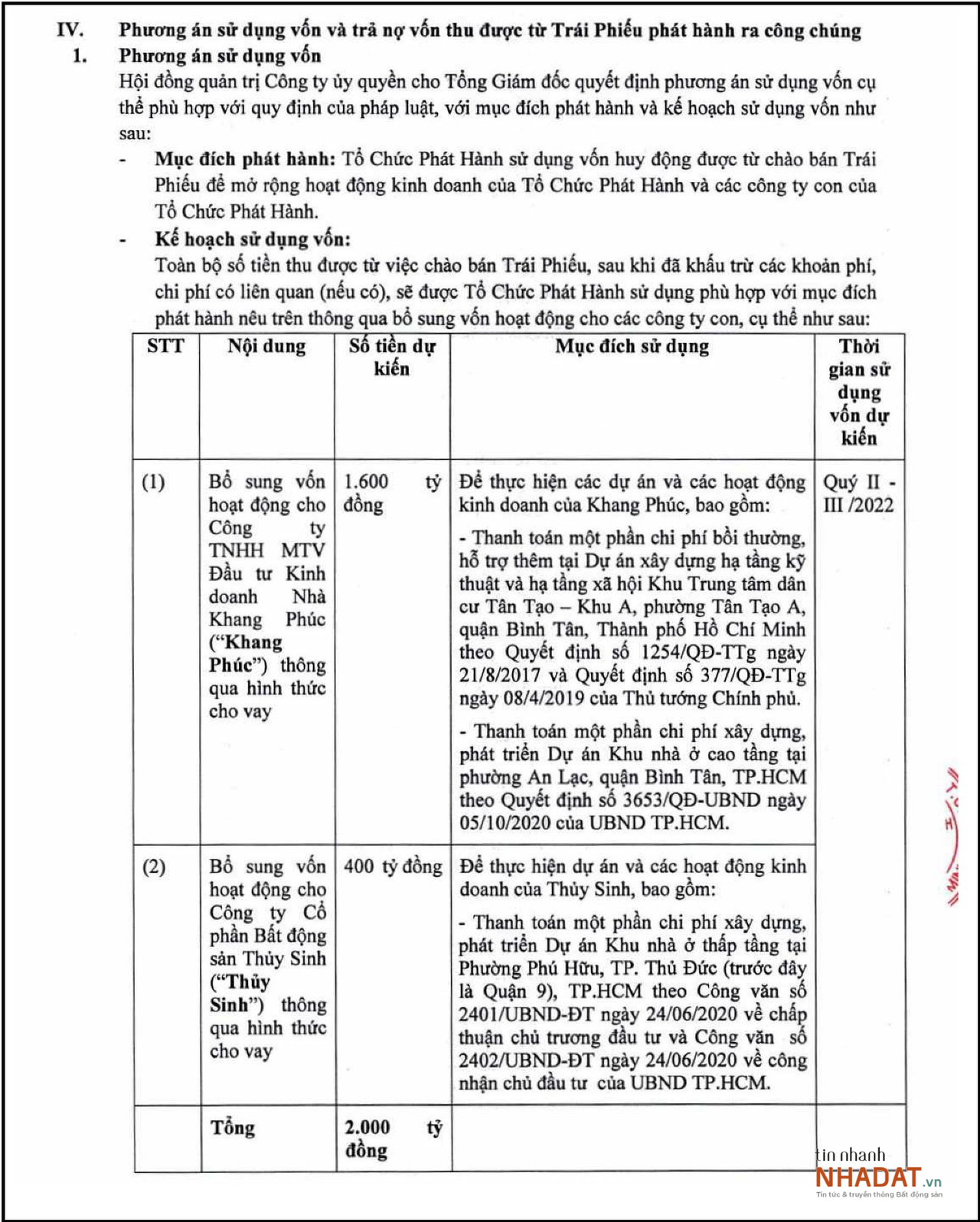Với 2.000 tỷ thu được sau khi đợt chào bán được hoàn tất, KDH dự kiến dùng 1.600 tỷ đồng bổ sung vốn hoạt động cho Công ty TNHH MTV Đầu tư kinh doanh Nhà Khang Phúc thông qua hình thức cho vay và 400 tỷ đồng bổ sung vốn hoạt động cho CTCP Bất động sản Thủy Sinh thông qua hình thức cho vay.