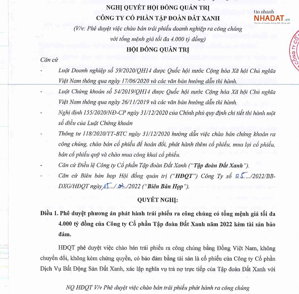 HĐQT Đất Xanh đã thông qua phương án phát hành tối đa 4.000 tỷ đồng trái phiếu ra công chúng trong năm 2022. Trái phiếu sẽ là loại không chuyển đổi, không kèm chứng quyền và được đảm bảo bằng cổ phiếu của CTCP Dịch vụ Bất Động Sản Đất Xanh (Dat Xanh Services – Mã: DXS).