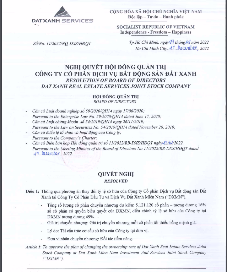 HĐQT CTCP Dịch vụ Bất động sản Đất Xanh - Đất Xanh Services (HOSE: DXS) vừa thông qua nghị quyết về việc giảm tỷ lệ sở hữu tại CTCP Đầu tư và Dịch vụ Đất Xanh Miền Nam.