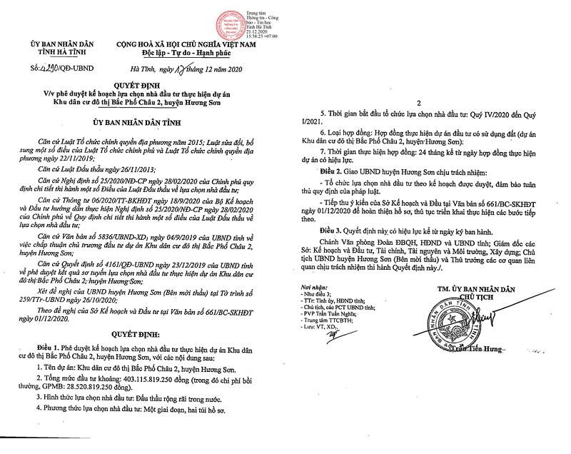 Theo thông báo chính thức trên cổng thông tin điện tử UBND tỉnh Hà Tĩnh, ngày 17/12 vừa qua, ông Trần Tiến Hưng – Chủ tịch UBND tỉnh Hà Tĩnh ký ban hành quyết định số 4290/QĐ-UBND phê duyệt kế hoạch lựa chọn nhà đầu tư thực hiện dự án Khu dân cư đô thị Bắc Phố Châu 2, huyện Hương Sơn.