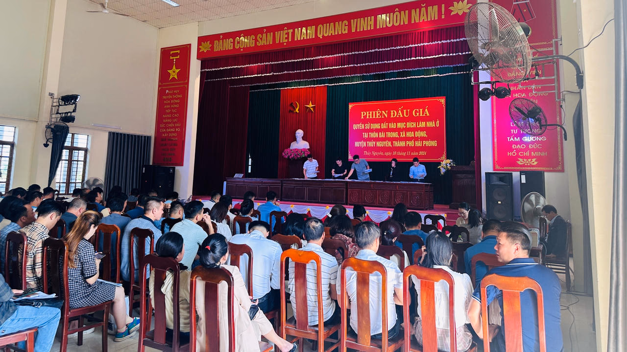 Sáng ngày 10/11/2024, Phiên đấu giá Quyền sử dụng đất vào mục đích làm nhà ở tại thôn Bái Trong, xã Hoa Động, huyện Thuỷ Nguyên với 69 lô đất.
