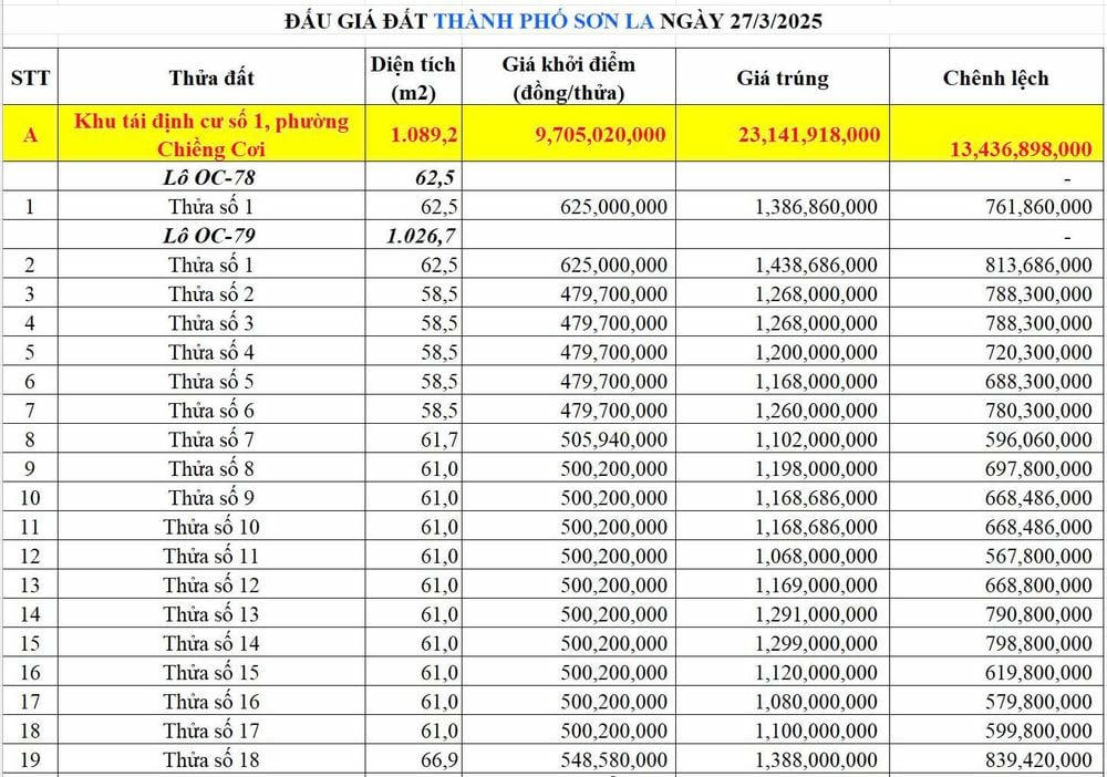 Đơn cử, tại Khu tái định cư số 1, phường Chiềng Cơi, lô đất có diện tích 62,5m2 có giá khởi điểm 625 triệu đồng, giá trúng đấu giá hơn 1,386 tỷ đồng (chênh lệch hơn 761,8 triệu đồng). Hay lô đất có diện tích 66,9m2 có giá khởi điểm 548,58 triệu đồng, được đấu thành công với giá 1,388 tỷ đồng (chênh lệch hơn 839,4 triệu đồng).