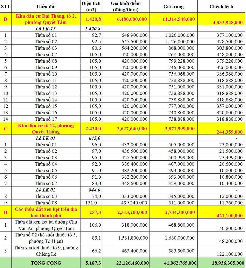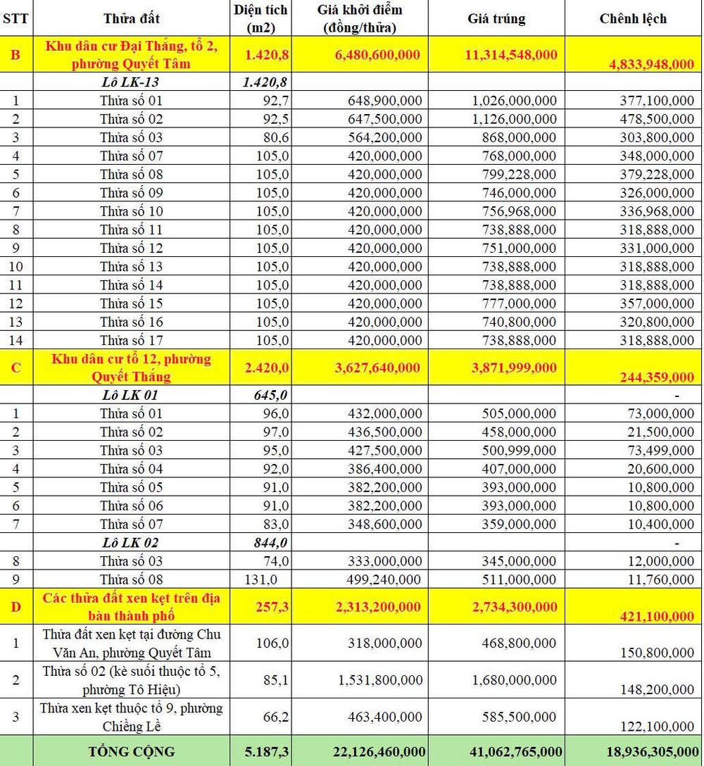 Tại Khu tái định cư Đại Thắng tổ 2, phường Quyết Tâm, một lô đất có diện tích 92,5m2, giá khởi điểm 647,5 triệu đồng, giá đấu trúng 1,126 tỷ đồng (chênh lệch 478,5 triệu đồng); lô đất có diện tích 105m2 có giá khởi điểm 420 triệu đồng, giá đấu trúng là 768 triệu đồng (chênh lệch 348 triệu đồng).