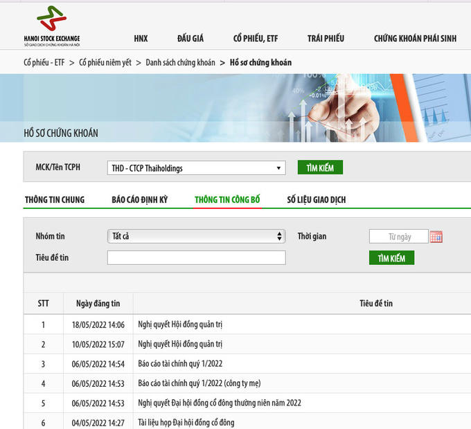 Ảnh chụp màn hình thông tin công bố liên quan Thaiholdings trên HNX sáng nay cho thấy ông Nguyễn Đức Thuỵ chưa công bố bất kỳ thông tin nào liên quan đến giao dịch của bầu Thuỵ