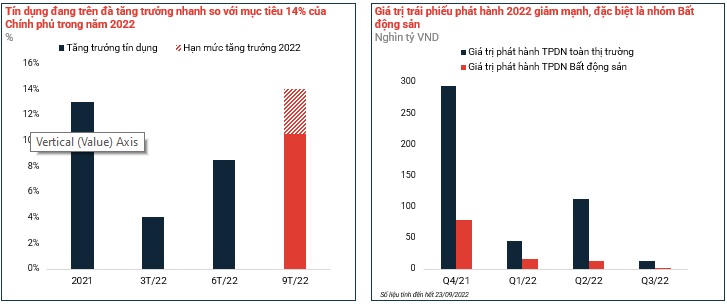 Bên cạnh đó, hoạt động của doanh nghiệp BĐS có cải thiện, trong 9 tháng đầu năm, lượng doanh nghiệp BĐS thành lập mới đạt 7.124 doanh nghiệp, tăng mạnh so với cùng kỳ. Lượng doanh nghiệp quay lại hoạt động là 1.769, cao hơn con số 998 so với cùng kỳ 2021. Vốn giải ngân đầu tư công dù chậm hơn so với kế hoạch nhưng vẫn đang được đẩy nhanh. Tuy nhiên tăng trưởng tín dụng hiện ở mức cao và tốc độ giải ngân công vẫn chậm so với chỉ tiêu đề ra.