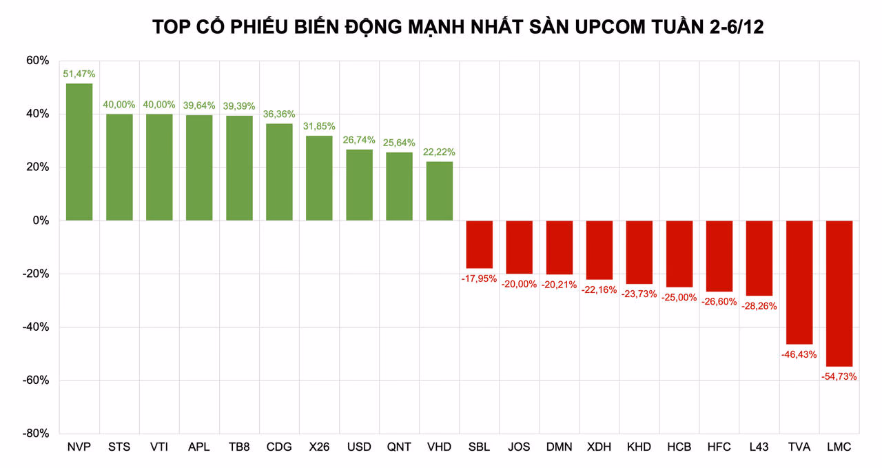 Danh sách 10 cổ phiếu tăng mạnh nhất sàn UPCoM tuần này là ghi nhận sự góp mặt của: NVP (+51,47%), STS (+40%), VTI (+40%), APL (+39,64%), TB8 (+38,89%), CDG (+36,36%), X26 (+31,85%), USD (+26,74%), QNT (+25,64%), VHD (+22,22%).