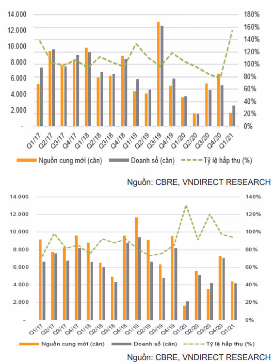 Nguồn cung căn hộ mới tại TP.HCM trong quý I/2021 giảm mạnh 52,9% so với cùng kỳ xuống còn 1.709 căn; dẫn đến lượng căn hộ tiêu thụ giảm 30,9% so với cùng kỳ (2.624 căn). VNDirect quan sát thấy đây là quý thứ 5 liên tiếp TP.HCM không có nguồn cung mới ở phân khúc bình dân. Tỷ lệ hấp thụ vụt lên 153,5% trong quý I/2021, tăng 77,0 điểm % so với quý trước, cho thấy nhu cầu nhà ở vẫn đang ở mức cao. Giá trung bình căn hộ sơ cấp quý 1/21 tăng 2,9% so với quý trước, tăng 14,6% so với cùng kỳ đạt 2.219 USD/m2.