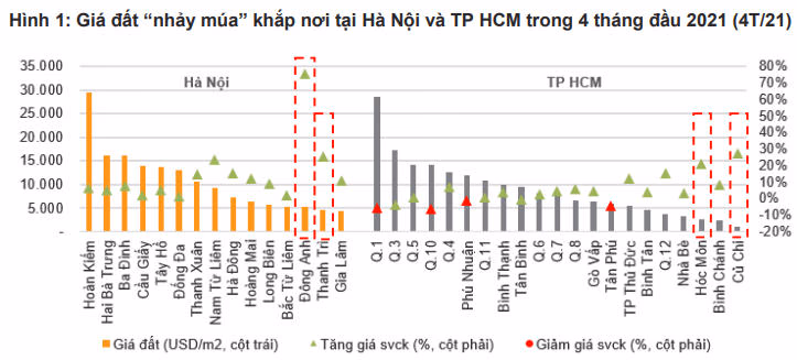 VNDirect nhận thấy giá đất tăng đột biến tại Đông Anh (tăng 75,5% so với cùng kỳ), Thanh Trì (tăng 25,6% so với cùng kỳ), Củ Chi (tăng 27,7% so với cùng kỳ), Hóc Môn (tăng 21,1% so với cùng kỳ). Giá đất trong những khu vực này tăng mạnh chủ yếu do công bố dự thảo quy hoạch sông Hồng và đề xuất đưa 5 huyện Hóc Môn, Bình Chánh, Nhà Bè, Củ Chi và Cần Giờ lên quận, song song với đề xuất thành lập thành phố Tây Bắc gồm Củ Chi và Hóc Môn.