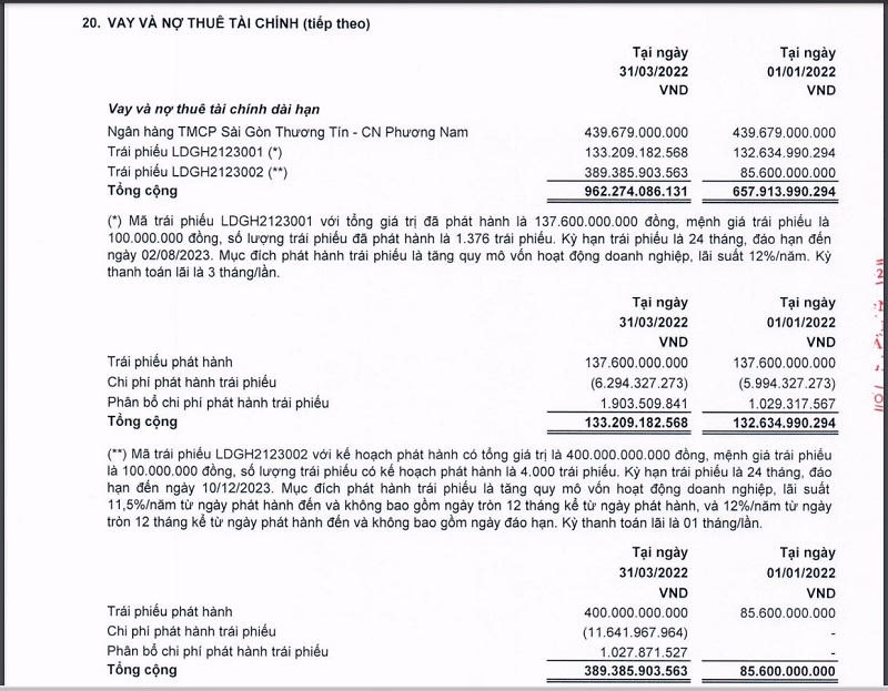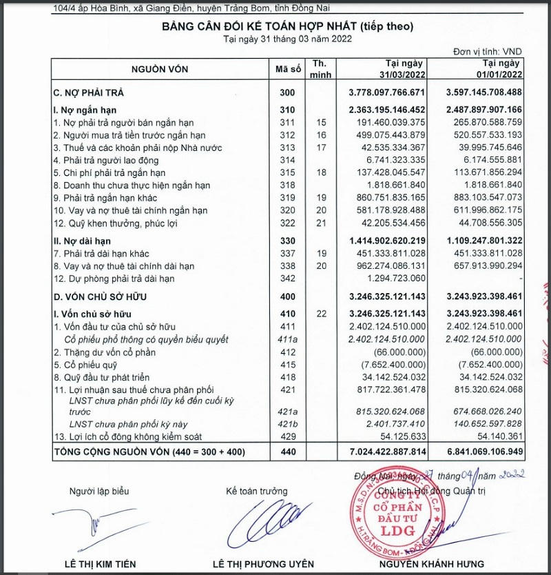 Về các khoản nợ phải trả, tính đến hết quý I/2022, LDG ghi nhận 3.778 tỷ đồng. Trong đó, nợ ngắn hạn là 2.363 tỷ đồng và nợ dài hạn là 1.415 tỷ đồng. Trong đó, vay và nợ thuê tài chính của LDG tăng lên 1.543,5 tỷ đồng và chiếm 22% tổng nguồn vốn và chiếm 47,5% vốn chủ sở hữu.