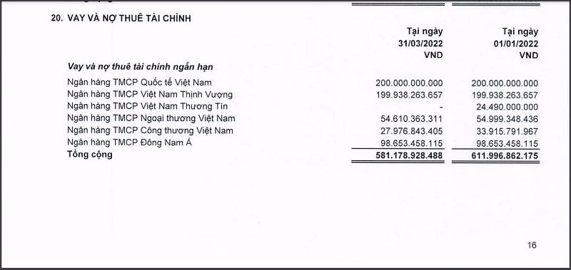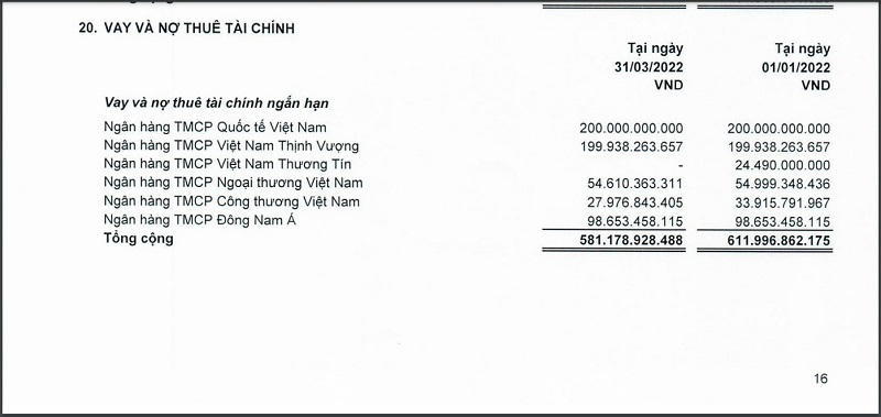 Theo thuyết minh báo cáo tài chính tính hình nợ vay của LDG, doanh nghiệp đang vay ngắn hạn 581,2 tỷ đồng từ các ngân hàng thương mại. Cụ thể, công ty vay Ngân hàng TMCP Quốc tế Việt Nam (VIB) 200 tỷ đồng, vay Ngân hàng TMCP Việt Nam Thịnh Vượng (VPBank) 199,9 tỷ đồng, vay Ngân hàng TMCP Ngoại thương Việt Nam (Vietcombank) 54,6 tỷ đồng, vay ngân hàng TMCP Công thương Việt Nam (Vietinbank) 27,9 tỷ đồng và Ngân hàng TMCP Đông Nam Á (SeABank) 98,6 tỷ đồng.