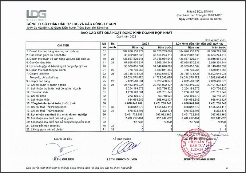 Vừa qua, Công ty Cổ phần Đầu tư LDG (Mã CK: LDG) đã công bố Báo cáo tài chính hợp nhất quý I/2022. Theo đó, trong quý I đầu năm, LDG ghi nhận doanh thu 126,57 tỷ đồng và lợi nhuận sau thuế đạt 2,4 tỷ đồng.