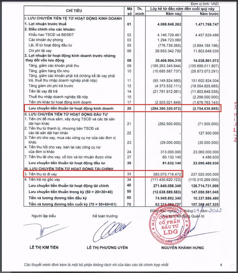 Đáng chú ý, mặc dù khoản doanh thu trong quý của LDG ghi nhận tăng mạnh nhưng dòng tiền lại ghi nhận âm đáng kể. Cụ thể, trong quý I/2022, dòng tiền kinh doanh chính của LDG âm 284,36 tỷ đồng, trong khi cùng kỳ âm 2,75 tỷ đồng.