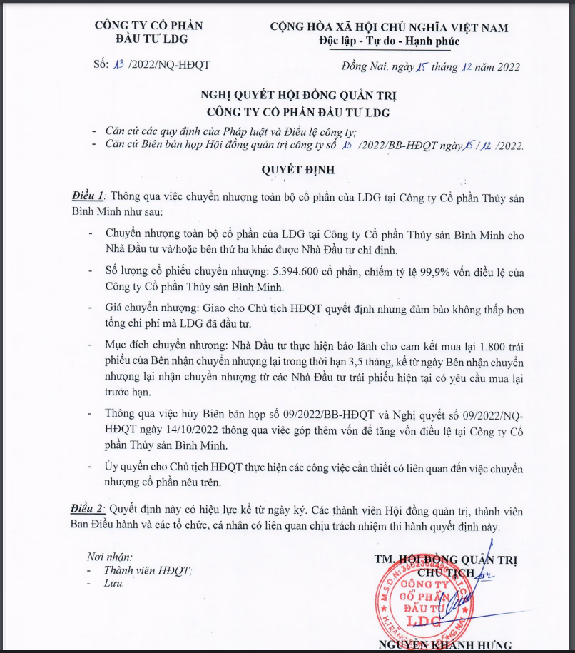 Hội đồng quản trị (HĐQT) CTCP Đầu tư LDG (Mã CK: LDG) vừa thông qua nghị quyết chuyển nhượng toàn bộ 5,4 triệu cổ phần của LDG tại CTCP Thủy sản Bình Minh (tương đương 99,9% vốn điều lệ) cho nhà đầu tư và/hoặc bên thứ ba khác được nhà đầu tư chỉ định.