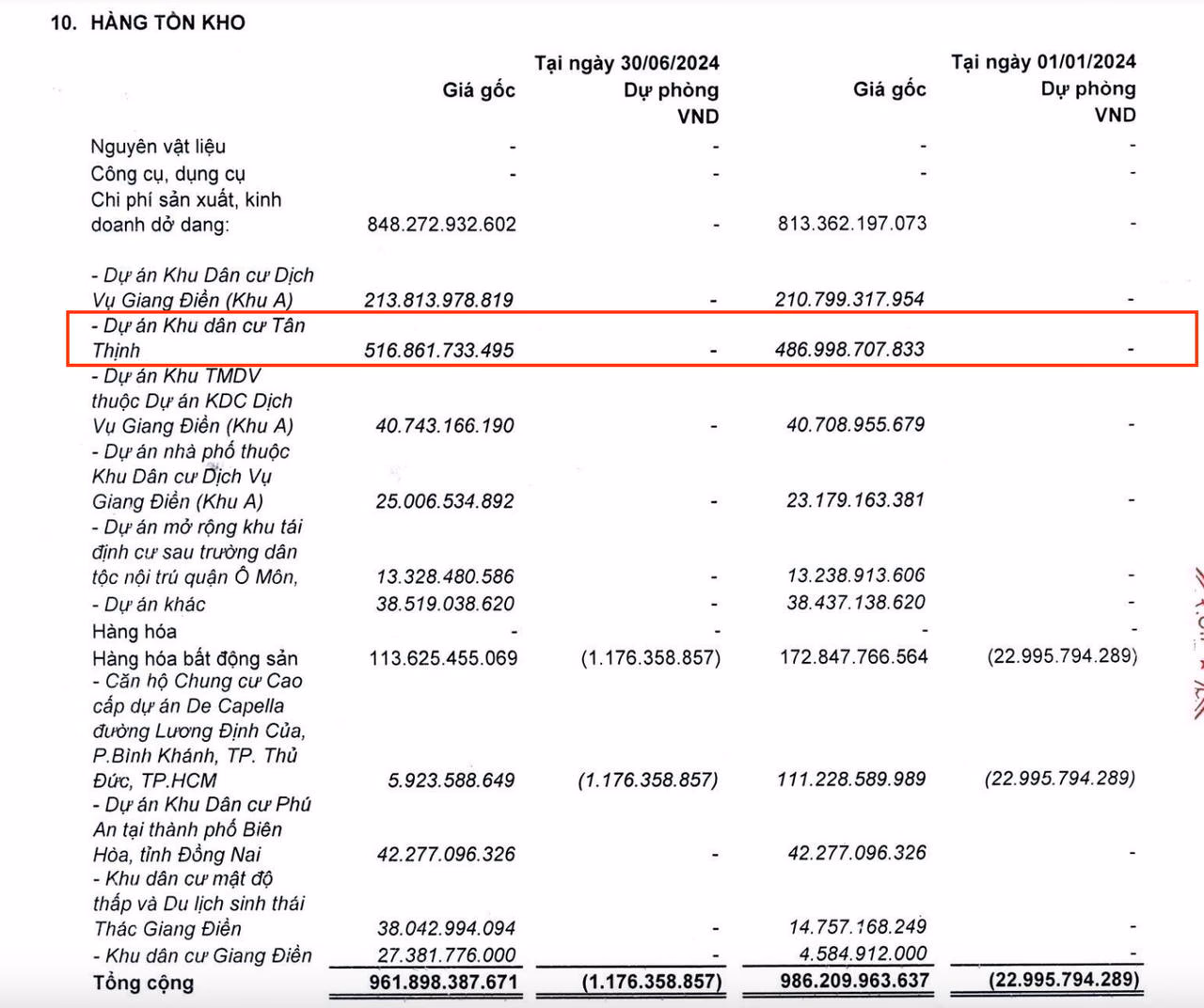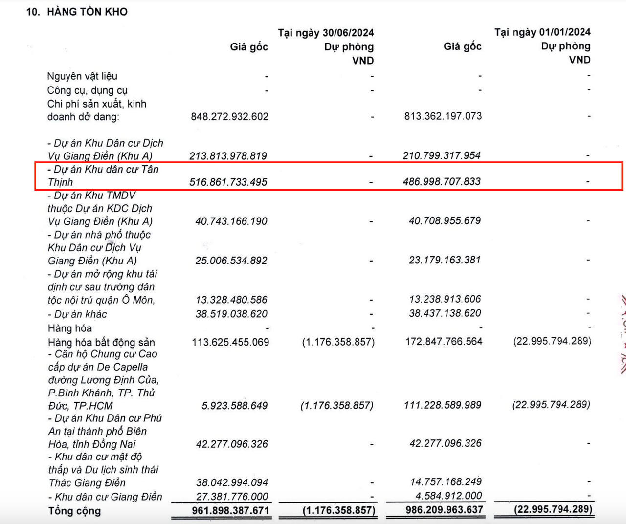 Hàng tồn kho là 961,9 tỷ đồng trong khi đó chi phí xây dựng dở dang là 848,3 tỷ đồng, chủ yếu nằm ở dự án Khu dân cư Tân Thịnh là 516,8 tỷ đồng, tăng lên gần 30 tỷ đồng so với thời điểm đầu năm.