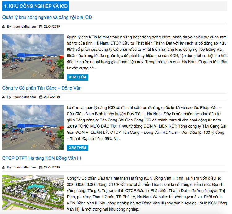 Bên cạnh đó, Công ty Thành Đạt cũng phát triển mạnh lĩnh vực quản lý các Khu công nghiệp. Thành Đạt với tư cách là cổ đông sở hữu 65% cổ phần của Công ty cổ phần Đầu tư Phát triển hạ tầng Khu công nghiệp Đồng Văn III. Vốn điều lệ 303 tỷ đồng. Ngoài ra, công ty cũng có công ty liên kết sở hữu 39% cổ phần của Công ty cổ phần Tân Cảng – Đồng Văn Hà Nam, công ty có vốn điều lệ 100 tỷ đồng.