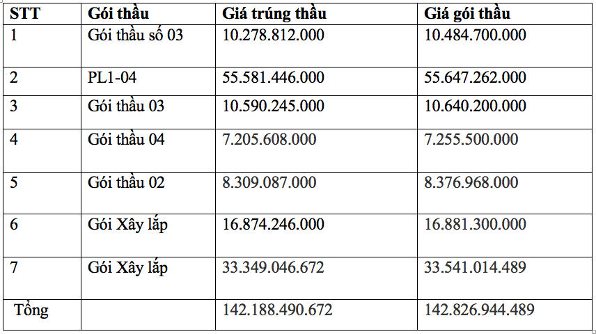 Tổng hợp 7 gói thầu mà Công ty Thành Đạt đấu trúng nói trên thì tổng giá trị gói thầu hơn 142,82 tỷ đồng, tổng giá trị đấu trúng hơn 142,18 tỷ đồng. Như vậy, tổng mức tiết kiệm ngân sách hơn 638,45 tỷ đồng, tỷ lệ trung bình chỉ đạt 0,45%.