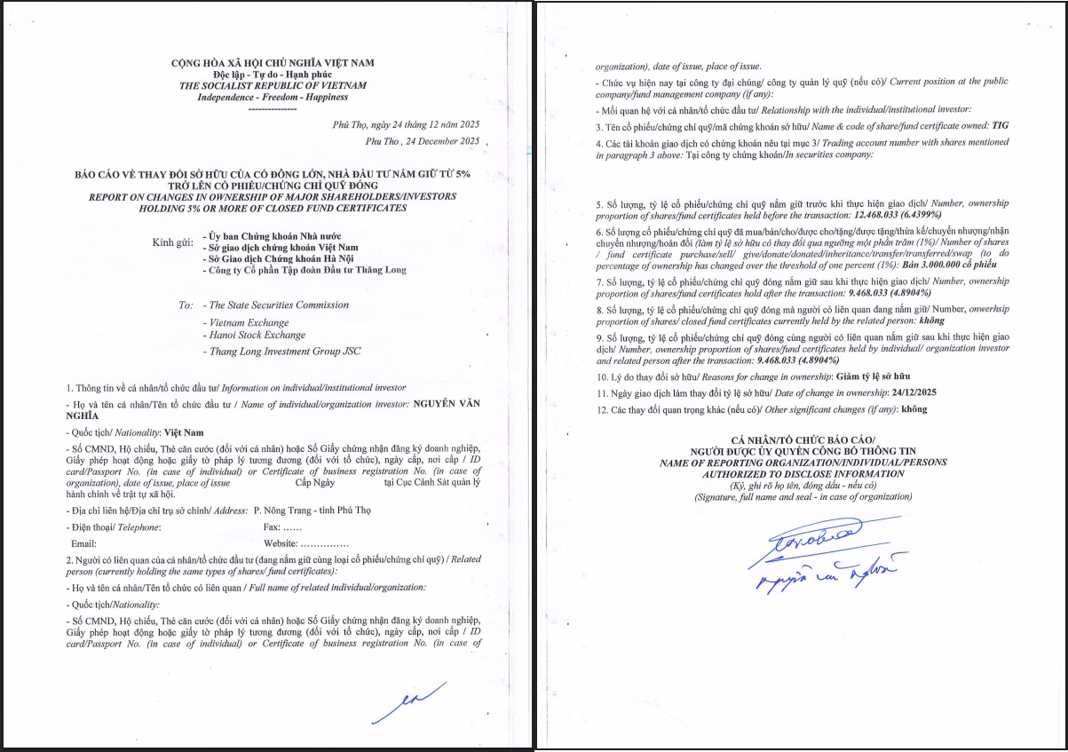 Ông Nguyễn Văn Nghĩa vừa có báo cáo về thay đổi sở hữu của cổ đông lớn, nhà đầu tư nắm giữ từ 5% trở lên cổ phiếu tại CTCP Tập đoàn Đầu tư Thăng Long (TIG).