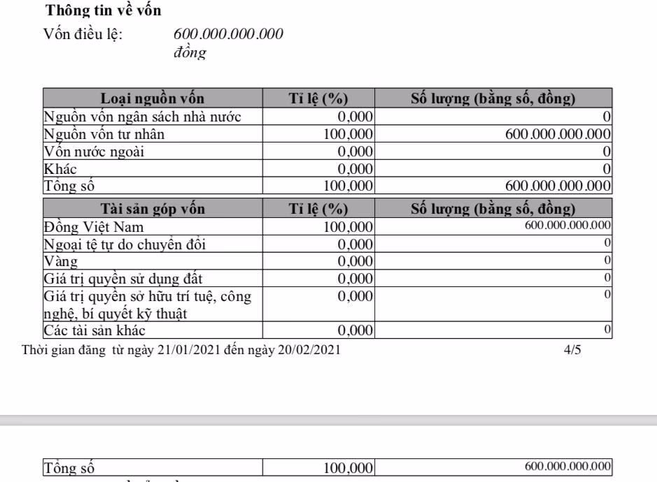 Cập nhật thay đổi gần nhất ngày 21/1/2021, Công ty DCH có màn tăng tốc ấn tượng về vốn điều lệ từ 120 tỷ đồng lên 600 tỷ đồng. Thành viên góp vốn không được tiết lộ. Tổng số lao động theo đăng ký thuế là 8 người.