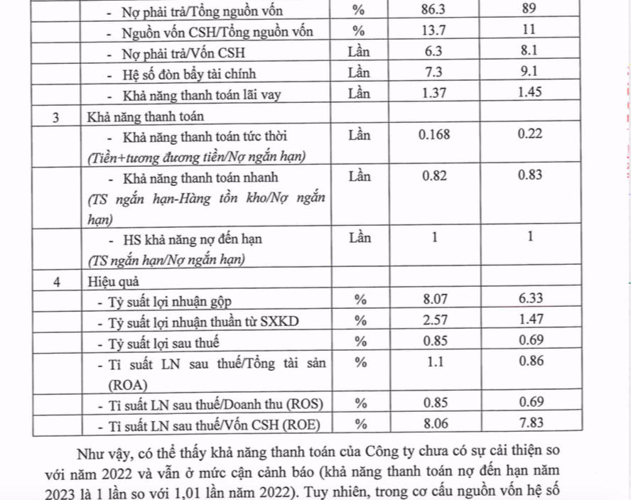 Điều này có thể thấy khả năng thanh toán của Công ty chưa có sự cải thiện so với năm 2022 và vẫn ở mức cận cảnh báo (khả năng thanh toán nợ đến hạn năm 2023 là 1 lần so với 1,01 lần năm 2022).
