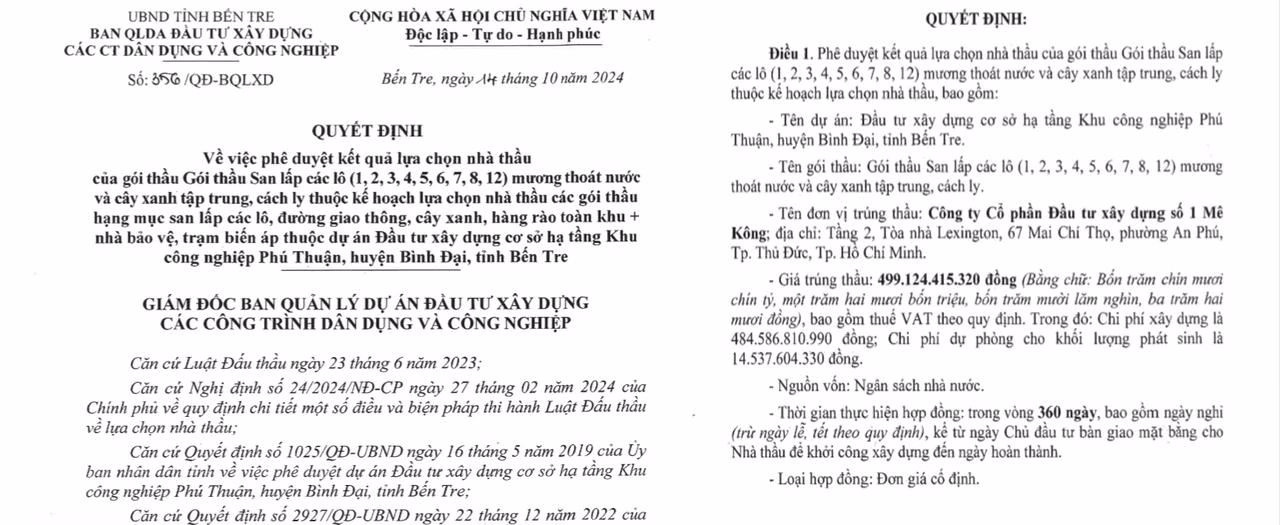 Theo đó, Công ty cổ phần Đầu tư xây dựng Số 1 Mê Kông (Số 1 Mê Kông) trúng thầu với giá 499,124 tỷ đồng, giá dự toán 500,15 tỷ đồng. Thời gian thực hiện hợp đồng 360 ngày, hợp đồng theo đơn giá cố định. Gói thầu được đấu thầu qua mạng, đóng thầu ngày 5/9/2024. Công ty Số 1 Mê Kông là nhà thầu duy nhất nộp hồ sơ dự thầu.