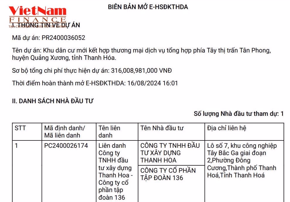 Công ty TNHH Đầu tư xây dựng Thanh Hoá và Công ty cổ phần Tập đoàn 136 là nhà đầu tư duy nhất nộp hồ sơ đăng ký thực hiện dự án Khu dân cư mới kết hợp thương mại dịch vụ tổng hợp phía Tây thị trấn Tân Phong, huyện Quảng Xương, tỉnh Thanh Hóa