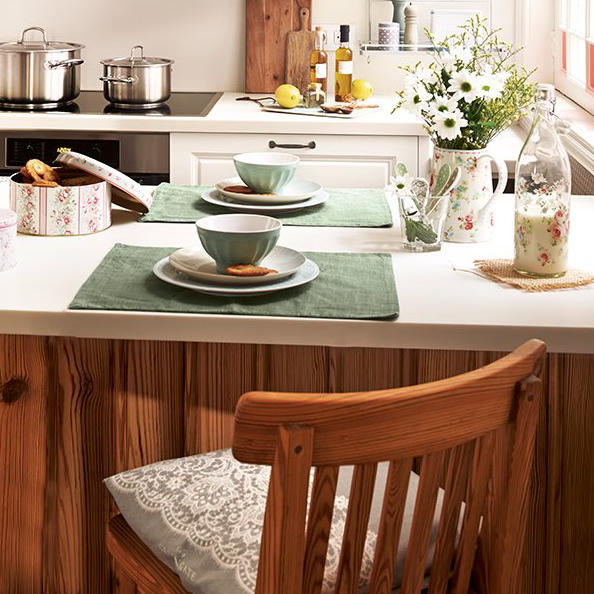 Bàn bếp nhỏ xinh và cũng là nơi để cất trữ đồ đạc