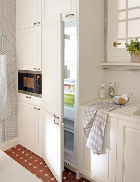 Chiếc tủ lạnh được thiết kế gắn liền với bức tường để tiết kiệm diện tích cho căn phòng.