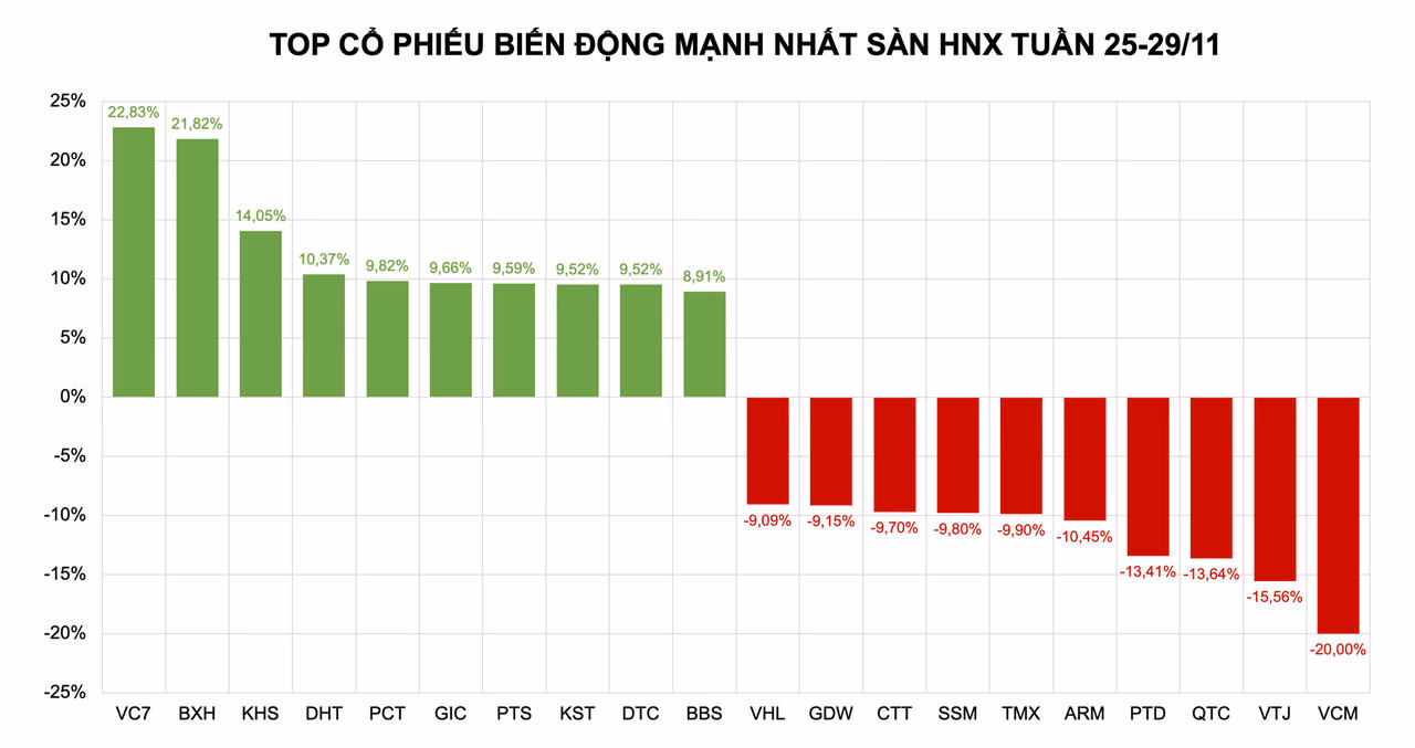 Trên sàn HNX, top 10 cổ phiếu tăng giá mạnh nhất bao gồm: VC7 (+22,83%), BXH (+21,82%), KHS (+14,05%), DHT (+10,37%), PCT (+9,82%), GIC (+9,66%), PTS (+9,59%), KST (+9,52%), DTC (+9,52%), BBS (+8,91%).