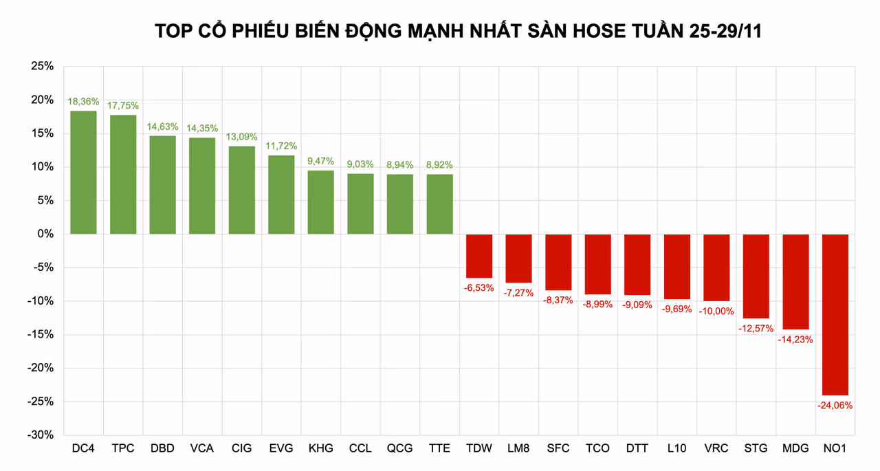 Ở chiều ngược lại, top 10 cổ phiếu giảm mạnh sàn bao gồm: NO1 (-24,06%), MDG (-14,23%), STG (-12,57%), VRC (-10%), L10 (-9,69%), DTT (-9,09%), TCO (-9,01%), SFC (-8,37%), LM8 (-7,27%), TDW (-6,53%).