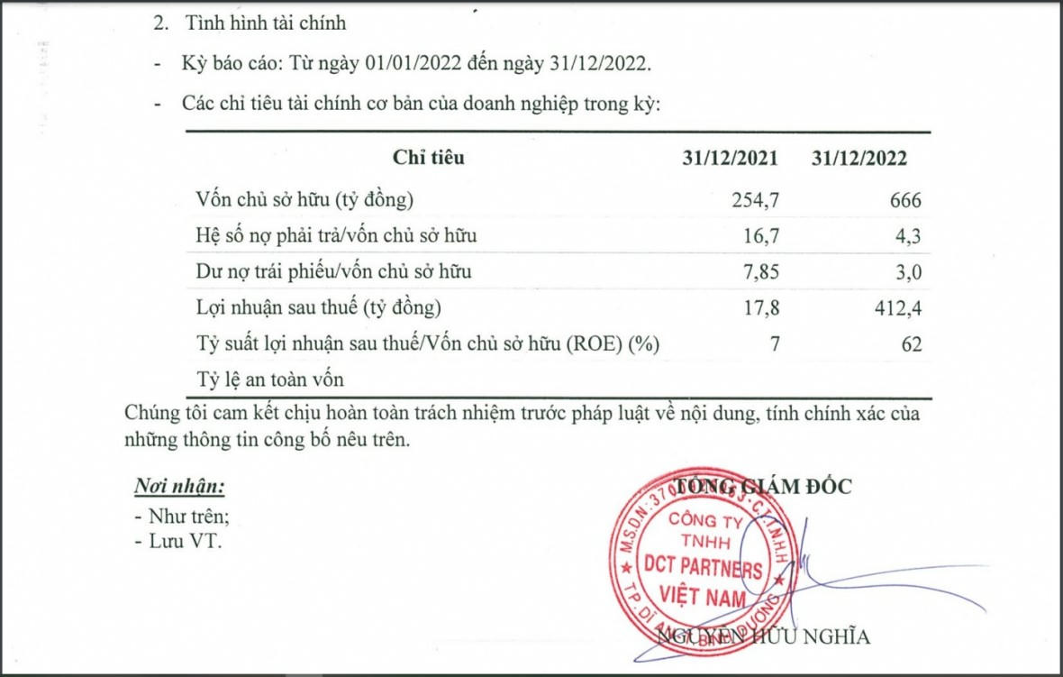 DCT Group cũng vừa công bố thông tin tài chính năm 2022, theo đó, doanh nghiệp ghi nhận lợi nhuận sau thuế hơn 412 tỷ đồng, gấp 23 lần cùng kỳ. Vốn chủ sở hữu của DCT tính đến cuối năm 2022 là 666 tỷ đồng.