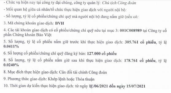 Giao dịch dự kiến được thực hiện từ ngày 18/6 đến 15/7, theo phương thức khớp lệnh hoặc thỏa thuận. Nếu hoàn tất giao dịch, số cổ phần BVH của Công đoàn Tập đoàn Bảo Việt nắm giữ sẽ giảm xuống còn 178.761 đơn vị, tương đương 0,024% vốn điều lệ của tập đoàn.